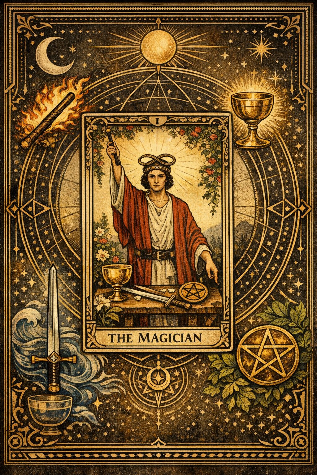 • Пръчки, чаши, мечове и монети подредени според четирите елемента.
